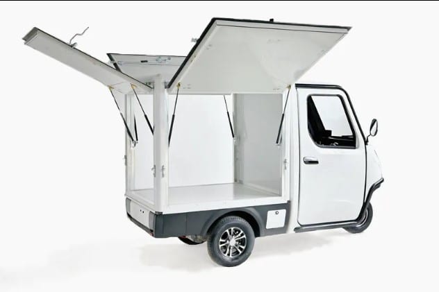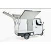 Café-modellen i hvid er bygget med en lukket, isoleret kasse, hvor både bagenden og de to sider kan åbnes via overhængte låger. Lågerne holdes af stærke støddæmpere og er udstyret med kraftige låsemekanismer, så du altid er sikret stabil drift. Resultatet er en fleksibel, robust og indbydende salgsbod, transport køretøj, event stand. Der kan bruges til alt fra street food til messestande eller pop-up events til at transporterer haveaffald, som flytte-hjælp eller blot til dagligdagens gøremål. En kompakt kabinescooter til nem og miljøvenlig transport, uanset om det er til erhverv eller privat behov.