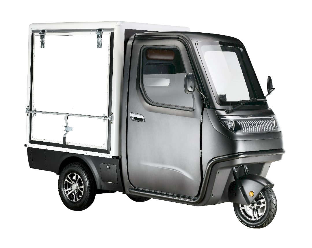 Café-modellen i mat grå er bygget med en lukket, isoleret hvid kasse, hvor både bagenden og de to sider kan åbnes via overhængte låger. Lågerne holdes af stærke støddæmpere og er udstyret med kraftige låsemekanismer, så du altid er sikret stabil drift. Resultatet er en fleksibel, robust og indbydende salgsbod, transport køretøj, event stand. Der kan bruges til alt fra street food til messestande eller pop-up events til at transporterer haveaffald, som flytte-hjælp eller blot til dagligdagens gøremål. En kompakt kabinescooter til nem og miljøvenlig transport, uanset om det er til erhverv eller privat behov.